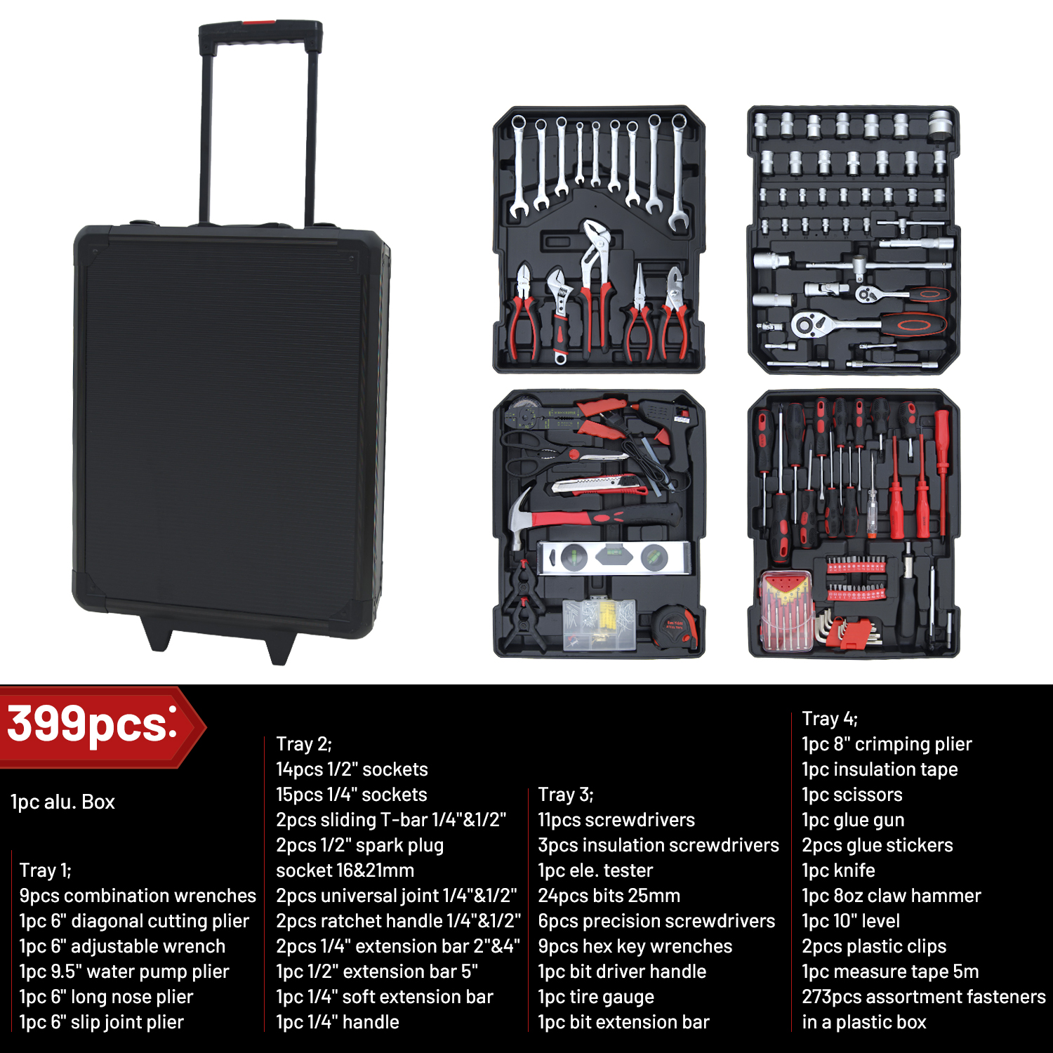 The toolbox is fully equipped with a variety of sizes of wrenches, sockets, screwdriver bits, and more. It can adapt to a wide range of repair scenarios and is suitable for home use, garages, and small-scale professional repairs.