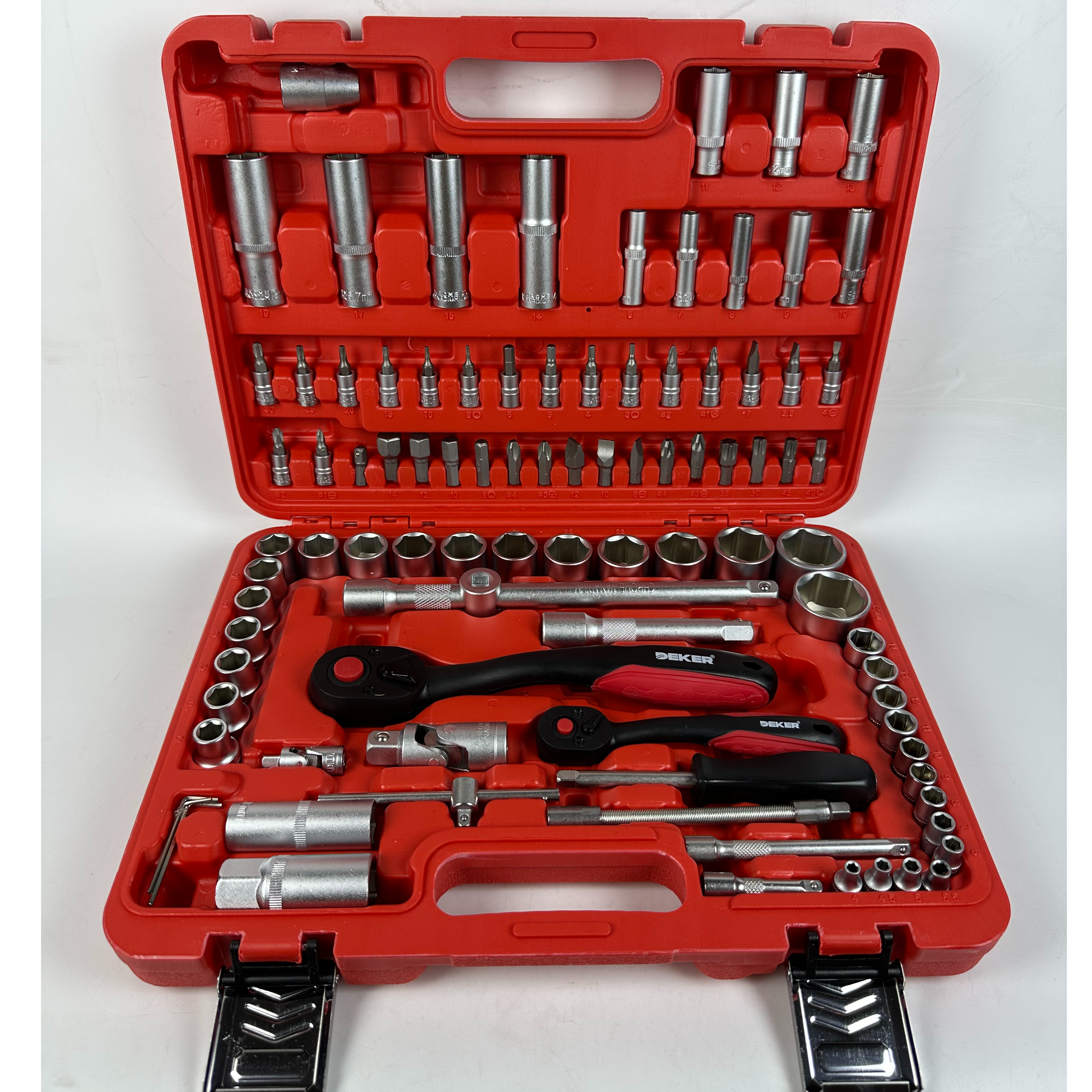 94-piece pro-grade kit: ratchets, metric/standard sockets, bits (hex/Phillips/Torx), extensions.