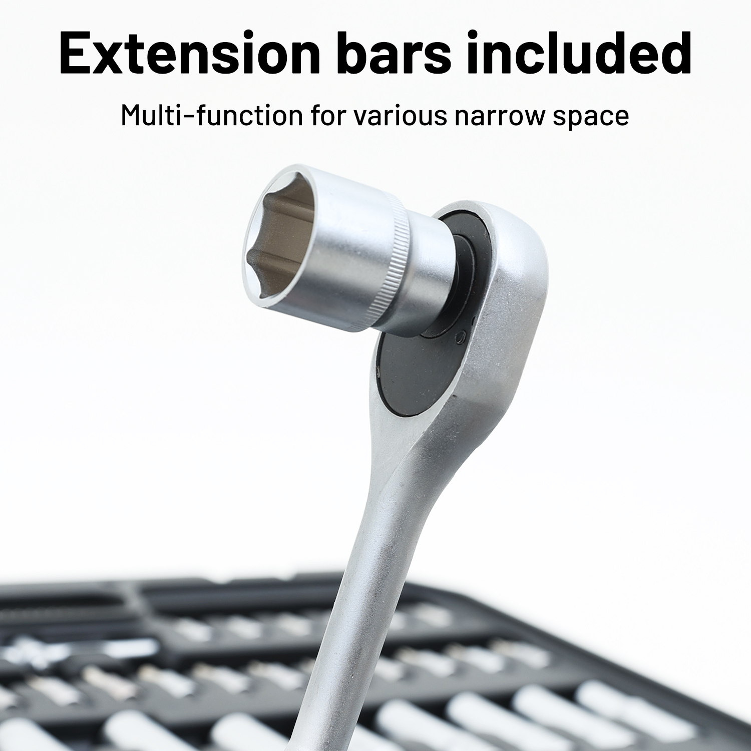 | Extension Bars | 6 pcs (2”/4”/6” for 1/4” and 3/8” drives) | Chrome-plated; heat-treated for strength. |