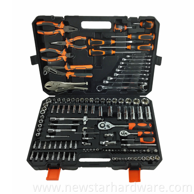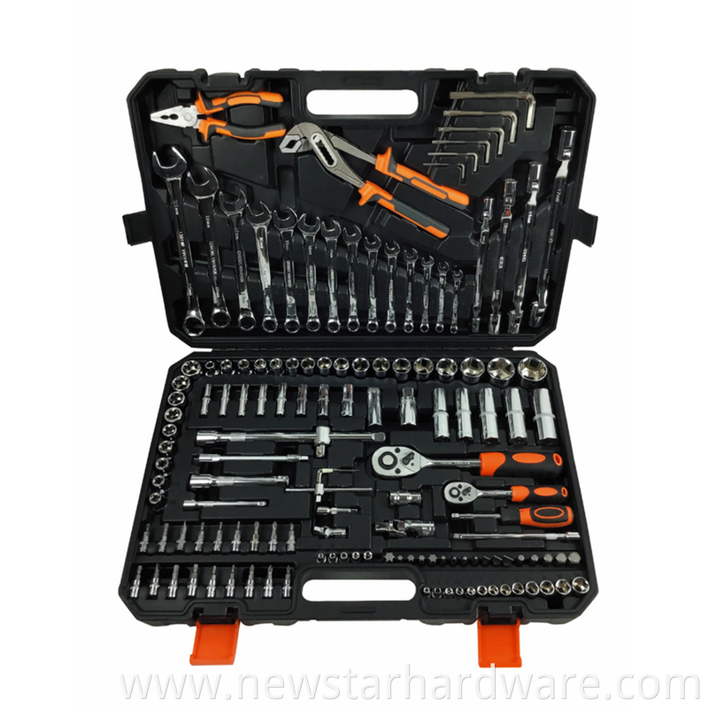 123PCS TOOL SET Hand Tool Kit Professional household tools in black color hard blow box. Tools including: 1-8" Adjustable wrench 1-9.5" Water pump plier 1-Knife 18-Bits 8-3/8" Sockets 9-1/4" Sockets 1-6" Linesman plier 1-3/8" Extension bar 1-3/8"...
