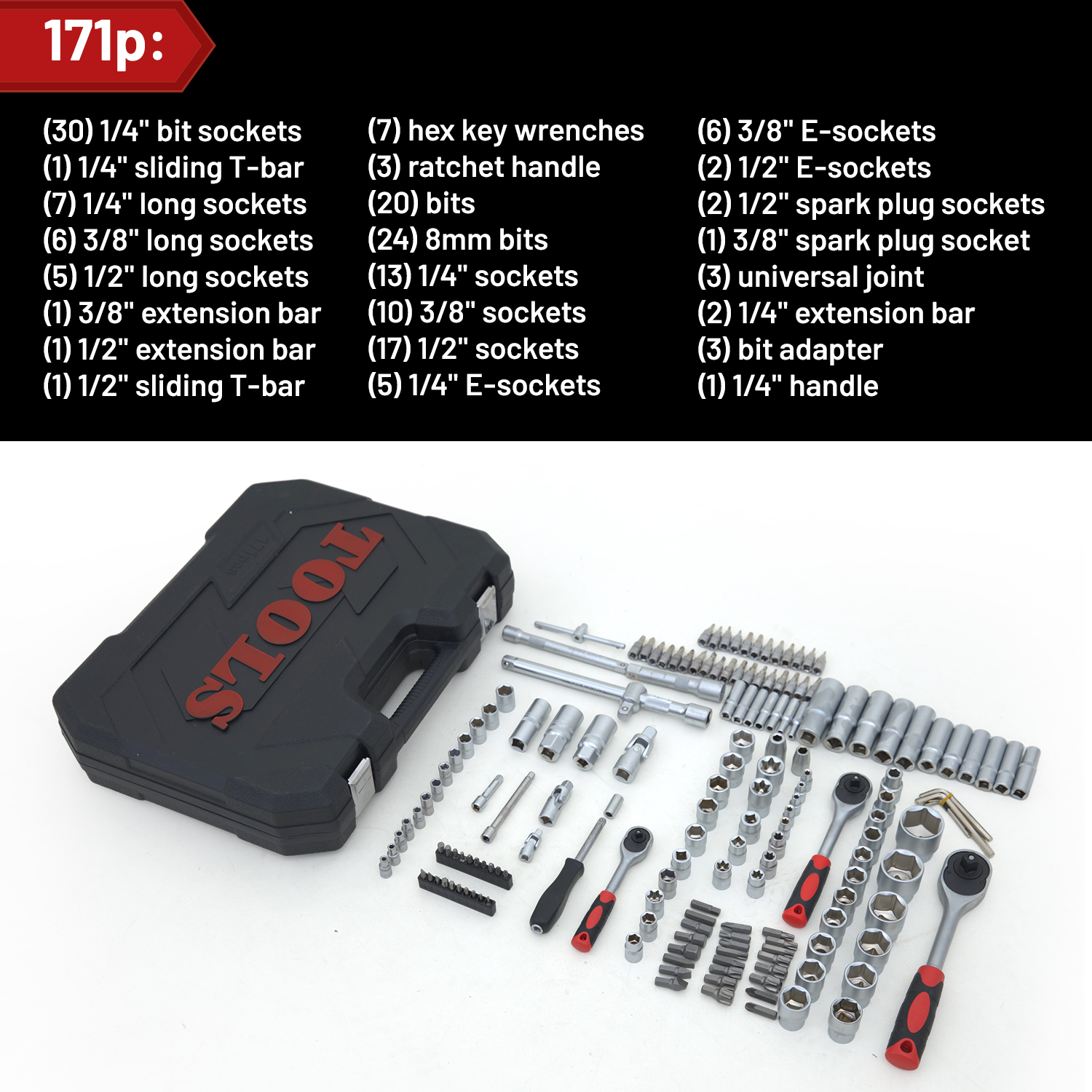171pcs 1/4"&3/8"&1/2"DR Socket Set Popular Socket Set Different colors Combination. Mechanics Tool Kit is a wonderful investment in turning your home garage into a semi-professional fix-it shop. With 75 pieces of the most popular socket...